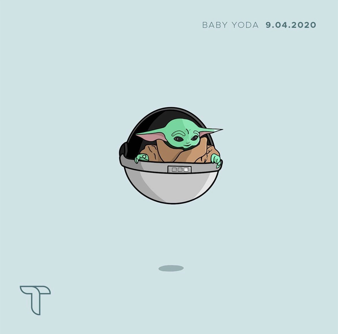 A minimalist vector graphic of 'baby yoda' from the show Mandalorian