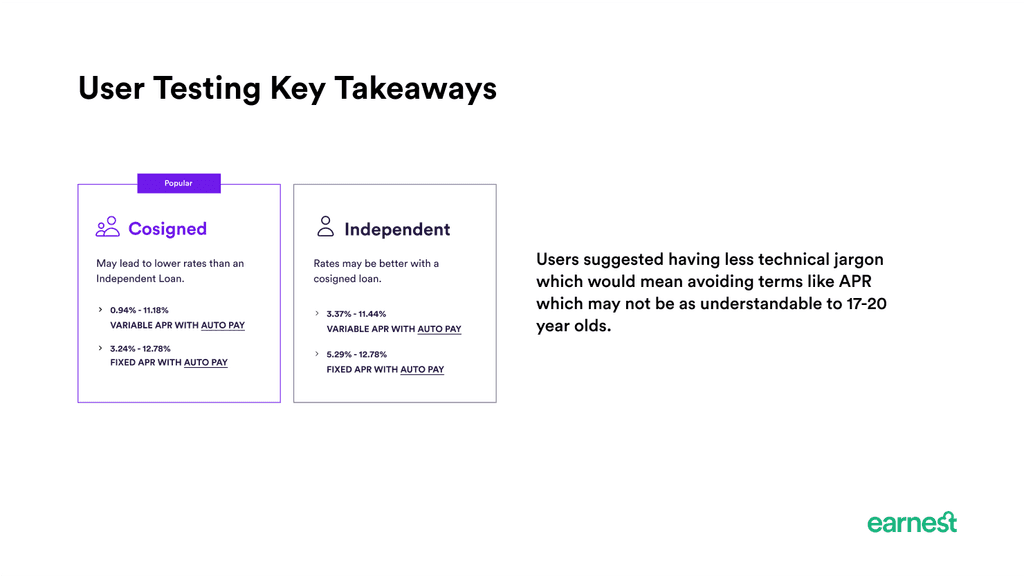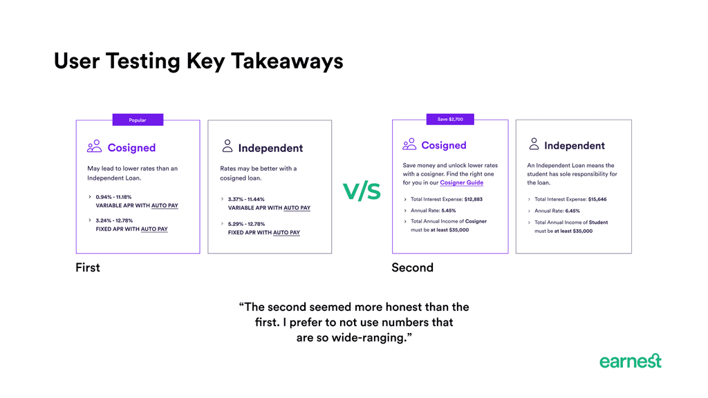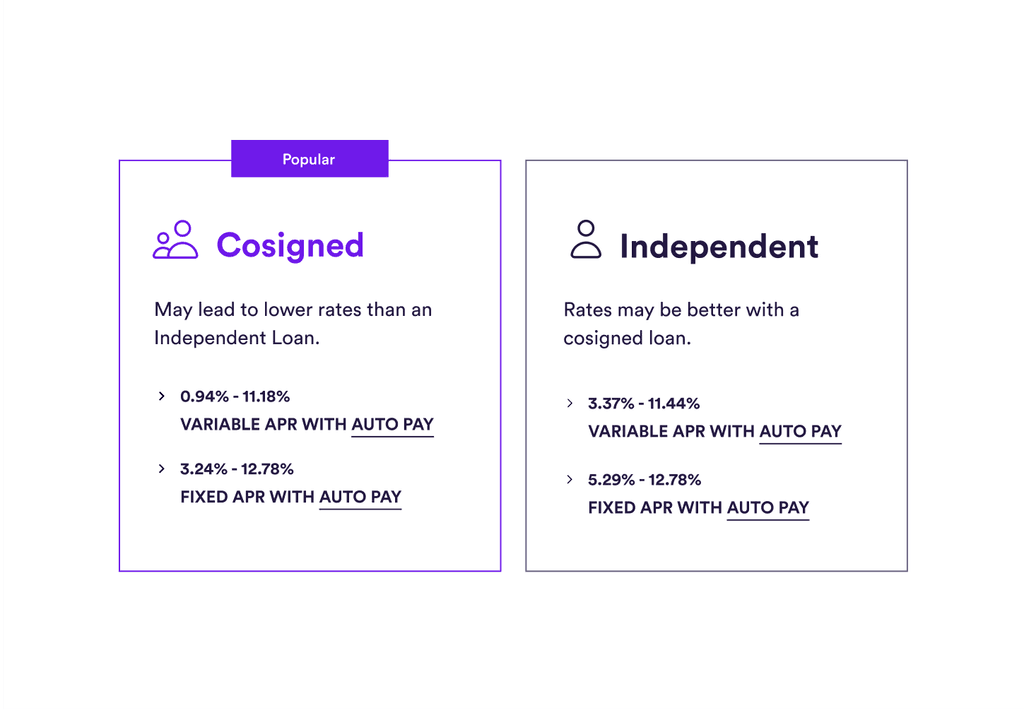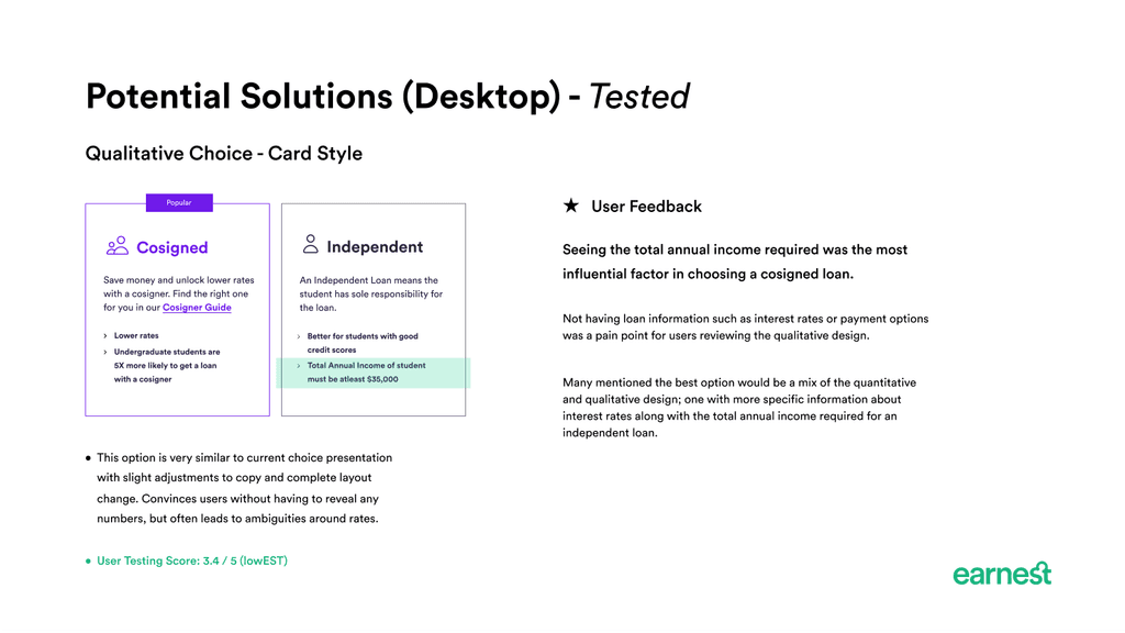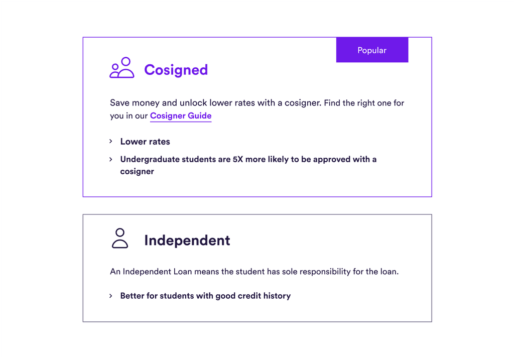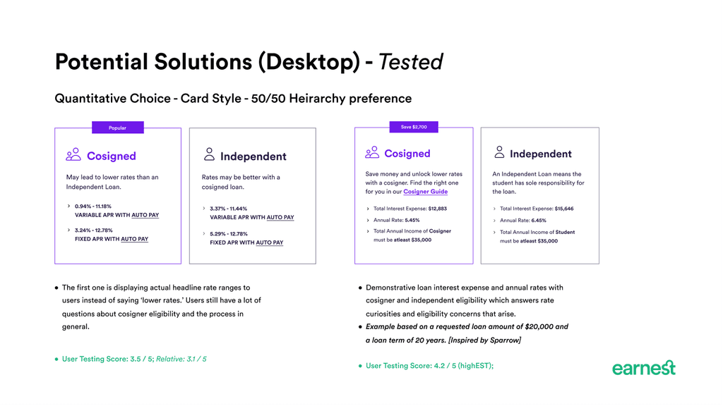 The redesign helped users to chose between independent vs cosigned loan with a confidence rate of 83% by presenting the key decision factors and removing ambiguity.