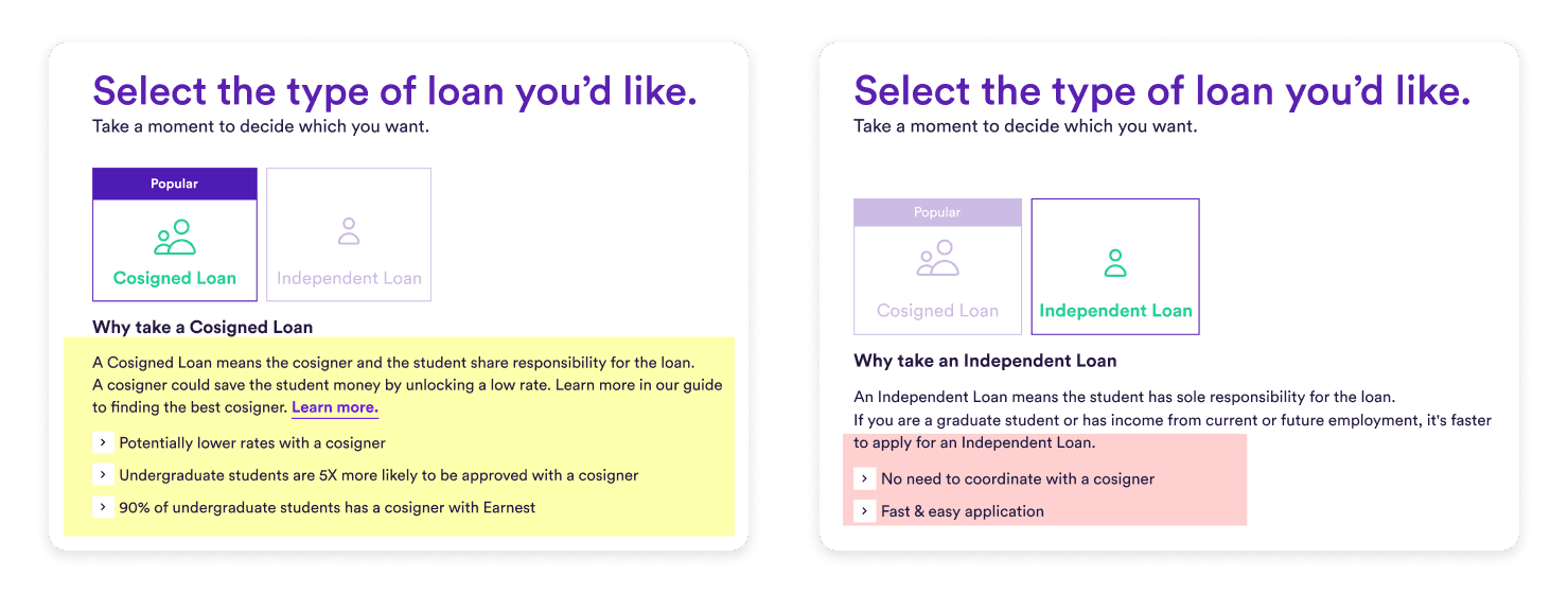 The current way of presenting the 2 loan choices is confusing, doesn’t display relevant information, and unintendedly convinces a type of user to select the wrong choice.